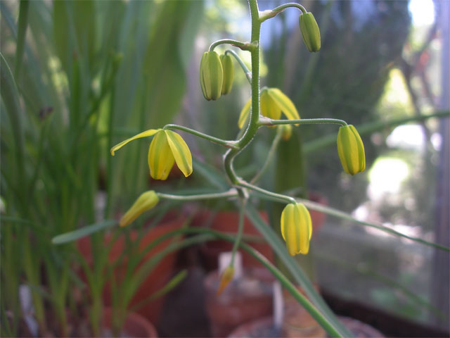 I kruka i växthuset blommar också Albuca shawii. Om man stryker med fingrarna på stjälken kan man känna att det doftar kåda.