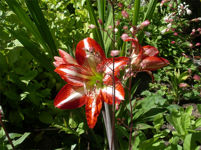 I vårens lilla lista fanns Hippeastrum vittatum med. De som vi planterade i kruka blommade för någon månad sedan medan denna som planterades i trädgården i slutet av maj blommar just nu.