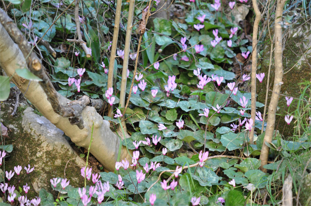 I Paroriravinen vid byn Mistras (distrikt Lakonia) växer den endemiska Cyclamen repandum ssp peloponnesiacum.