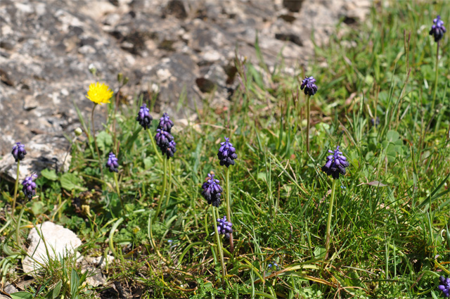 Ganska allmän är den lilla pärlhyacinten Muscari commutatum