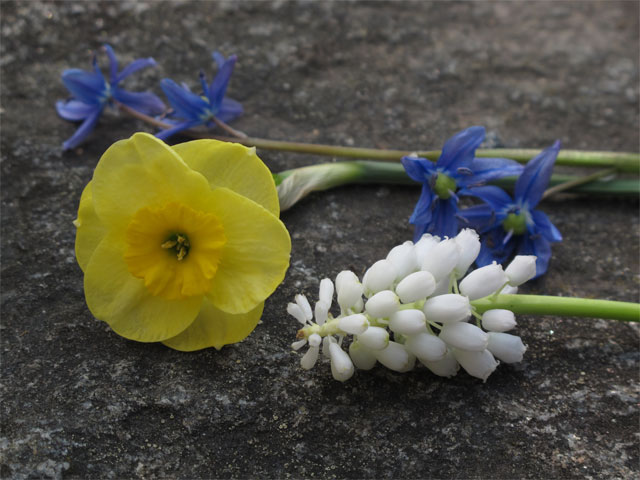Narcissus ’Sun Disc’, Scilla amoena och Muscari armeniacum ’Venus’