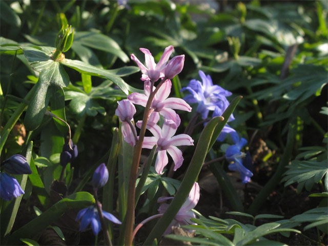 Nu blommar nästan alla scillorna. Här siberica, forbesii Pink Giant och luciliae. Bakom dom överblommade vintergäck med ännu gröna blad.